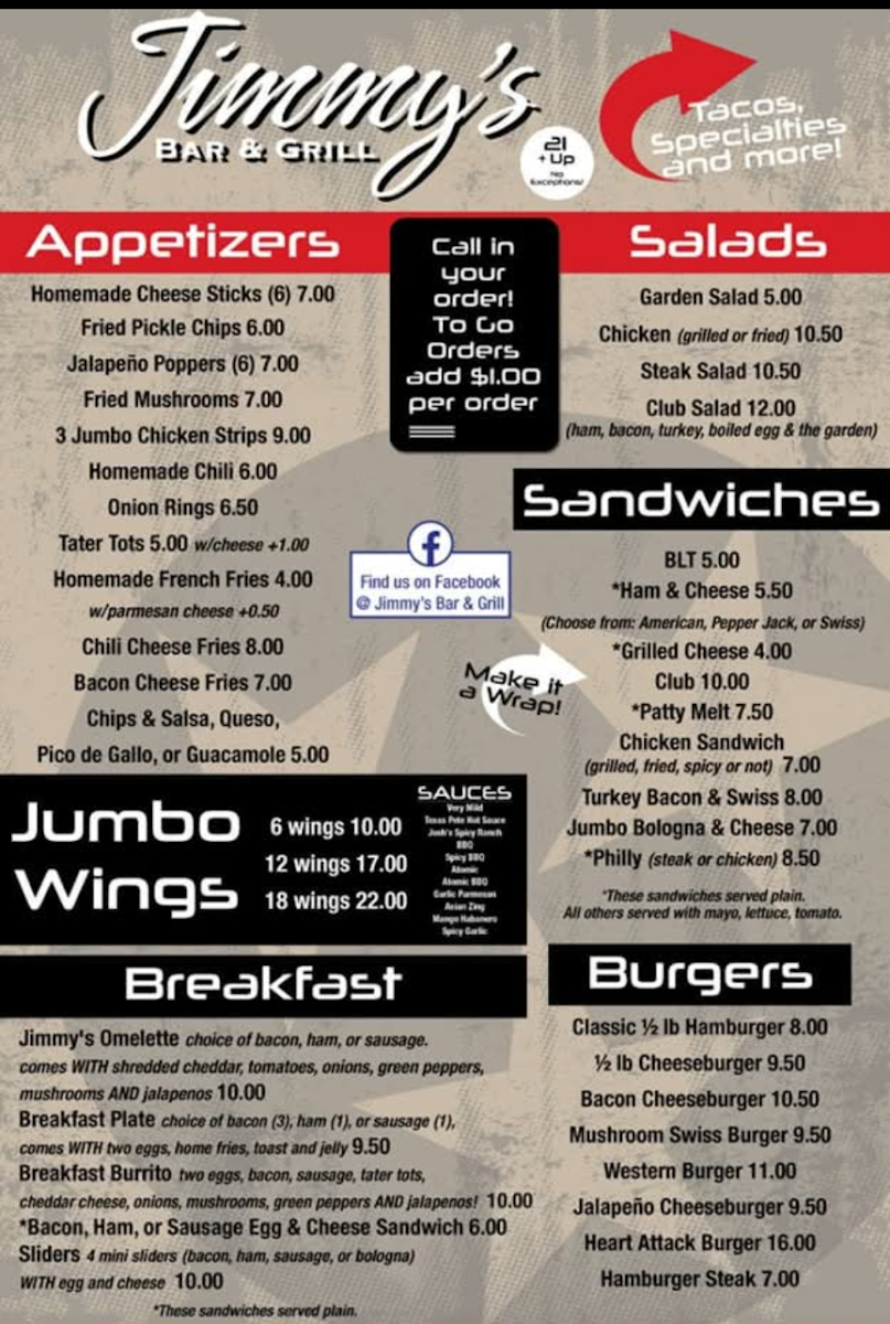 Welcome to Jimmy's Sports Bar & Grill, a vibrant dining destination located at 1310 Sparta Pike in Lebanon, TN. This establishment combines a lively atmosphere with a menu that boasts an impressive selection designed to satisfy all cravings.